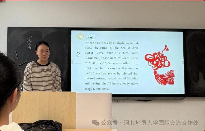 活动伊始,汉语国际教育专业的学生作为文化讲解员,向来华留学生们介绍了中国结的文化内涵。从中国结的历史渊源出发,详细讲解了其在不同朝代的发展演变,以及“同心结”“吉祥结”等不同款式所承载的团圆、祈福等美好寓意,让留学生们对这一传统手工艺有了初步的文化认知。