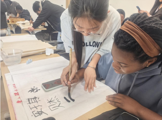 在随后的实践环节中,中外学生分组结对,进行现场教学与指导。他们从最为基础的执笔姿势、运笔方法教起,耐心演示如何蘸墨、如何起笔、行笔与收笔。留学生们在“文化使者”们手把手的帮助下,从最初的生疏颤抖,到逐渐能写出简单的笔画和诸如“福”、“和”、“友”等蕴含美好寓意的汉字。笔墨纸砚的交融间,不仅传递着书写的技巧,更流淌着真诚的友谊。留学生们沉浸于墨香之中,亲身感受着中国书法所特有的节奏感、力度与意境之美。